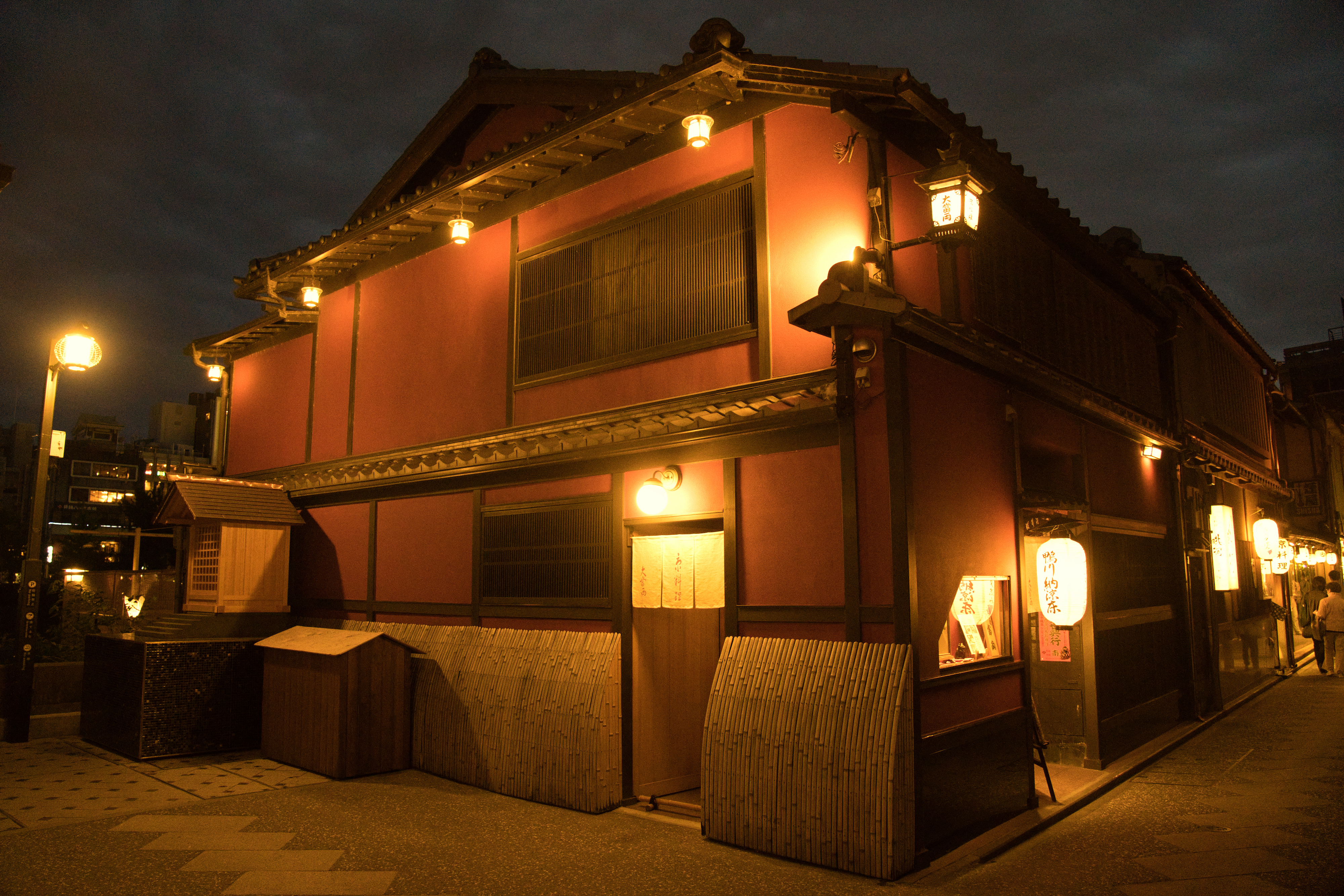 創業九十余年、先斗町で育まれてきた佇まい。大當両を象徴する弁柄色の外観を背に、釣り行灯や燭台の柔らかな光に包まれる夜の床は、今も昔も変わらぬ妖艶な趣を伝えています。座布団で寛ぐ昔ながらの座敷スタイルで、古都の情緒とともに京の味を心ゆくまでお愉しみください。